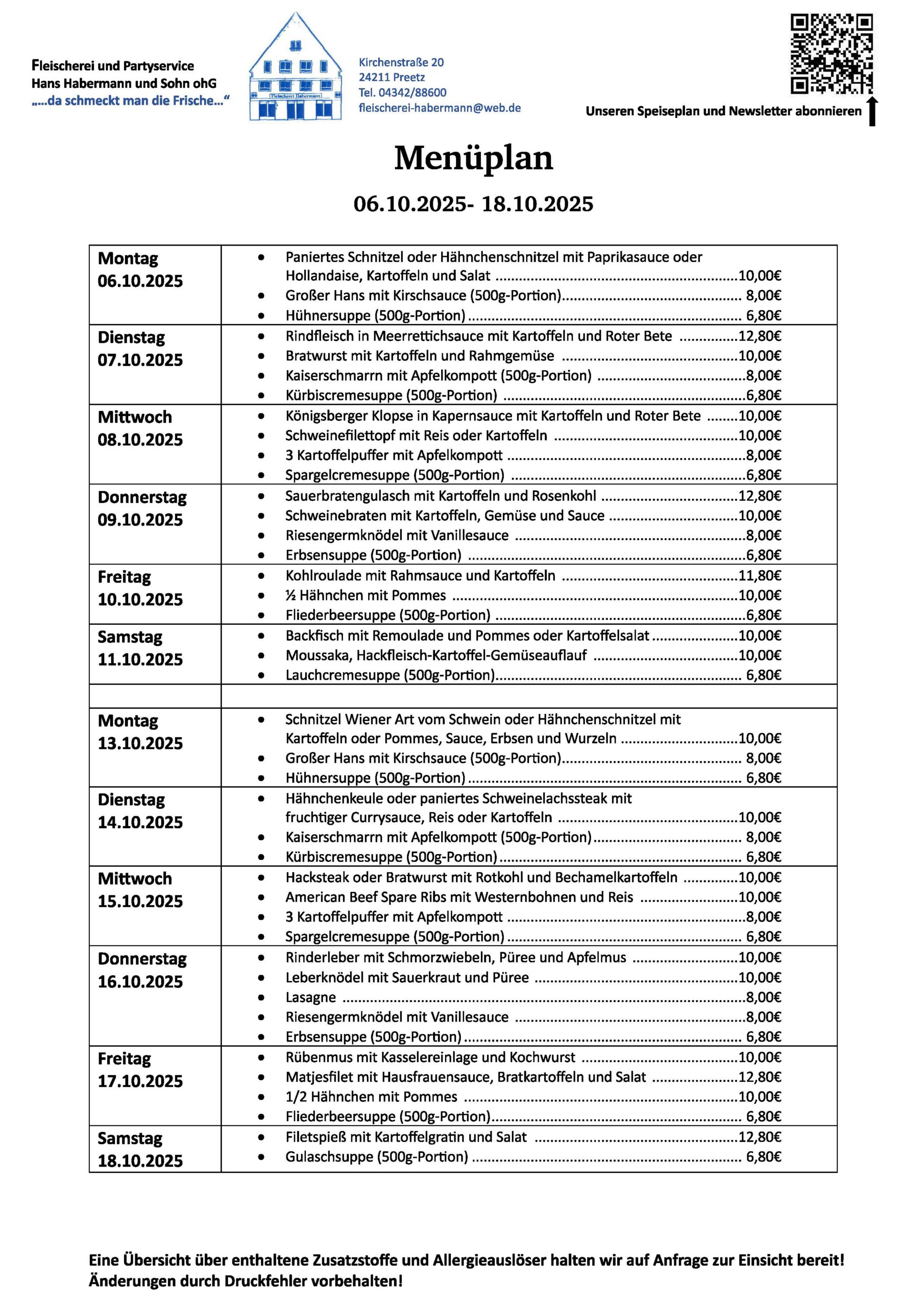 Hier finden Sie stets den aktuellen Speiseplan. Wir kochen täglich frisch für Sie, mit guten frischen Zutaten sowie mit Liebe und Professionalität.