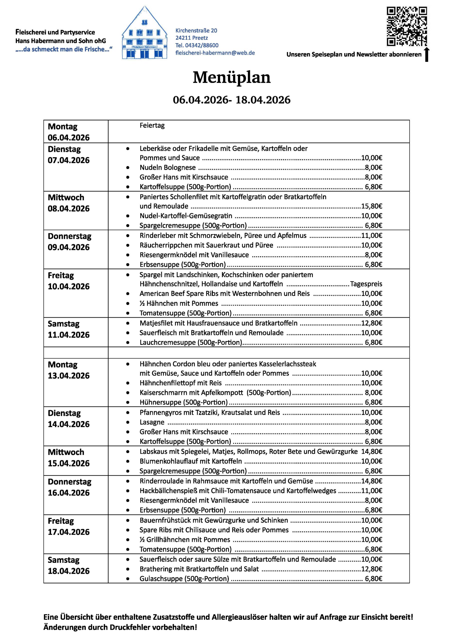 Hier finden Sie stets den aktuellen Speiseplan. Wir kochen täglich frisch für Sie, mit guten frischen Zutaten sowie mit Liebe und Professionalität.